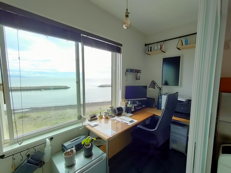 コロナ禍でリモートワークが増えたご主人のワークスペースの増築です。海に面した絶好のロケーションの2階の寝室の南側に2.5帖(1.3m×3.0m程)のスペースを。2階の外壁が青い部分が今回増築した部分です。