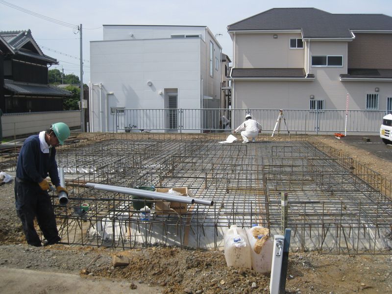 左下の写真は配管工事が完了し、土間コンクリートを打とうとしているところです。