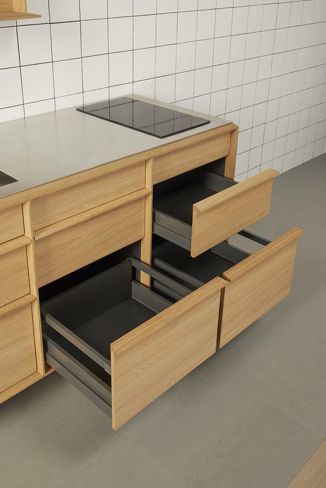 カリモク家具とサンワカンパニーが共同開発して、国産ナラ材を使った家具調のコンパクトキッチンを作りました。