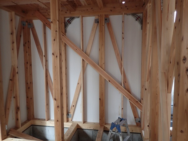 上の写真の上の方に付いているバネみたいな金物が制震装置です。白い壁はモイスという耐震に必要な壁。更に斜めの木は筋交いという耐震のための材木です。