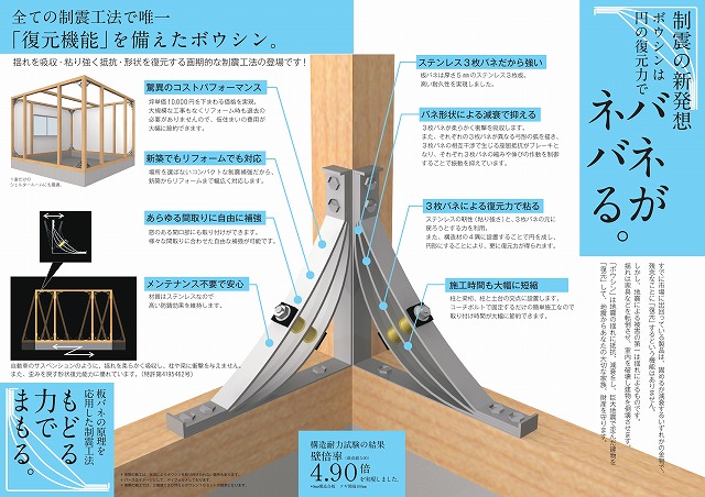 ボウシンは他の制震装置に比べ、小さいので、窓の上にもつけられるので、プランに制約が少ない優れた制震装置です。工事も簡単です。