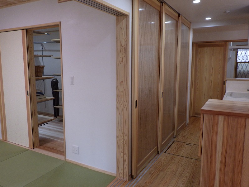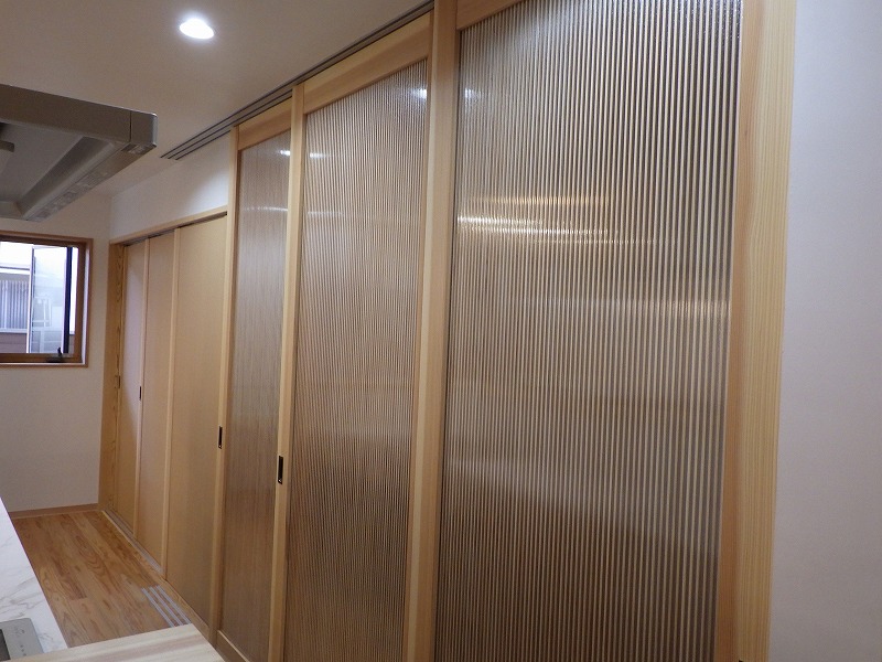 奥様から電子レンジ等の家電収納、食器戸棚、冷蔵庫を隠したいというご要望があり、3枚の引戸で隠せるようにしました