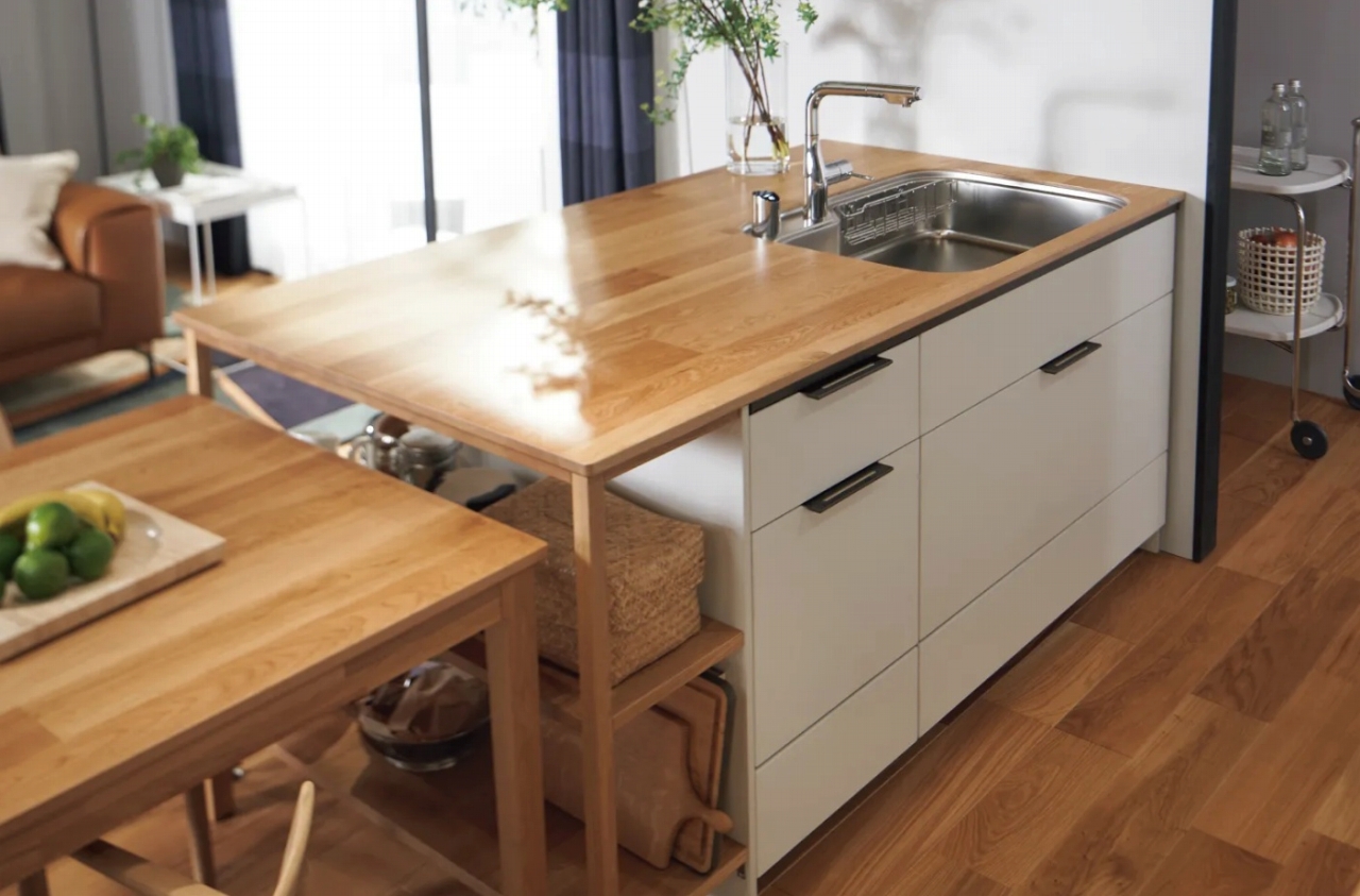 「天然木ワークトップ」は、木質建材メーカーの朝日ウッドテックと共同開発。