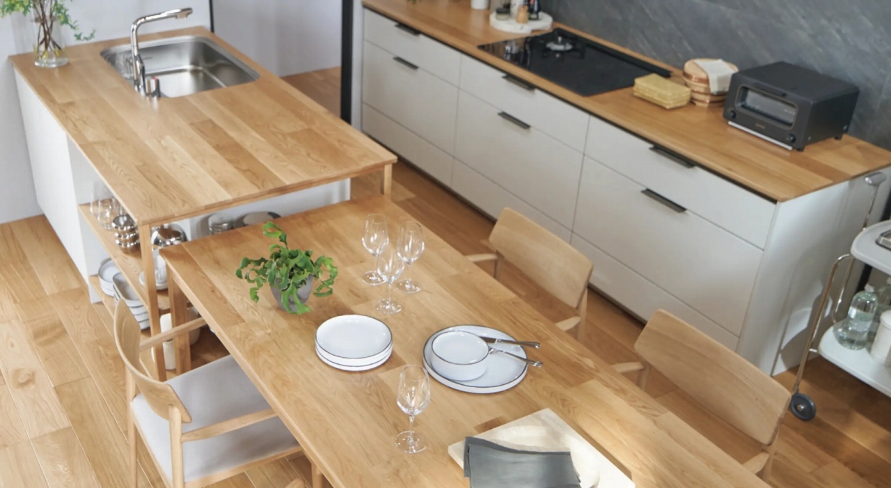 キッチン専業メーカーのクリナップは、木のキッチンを中心とした空間づくりを提案。