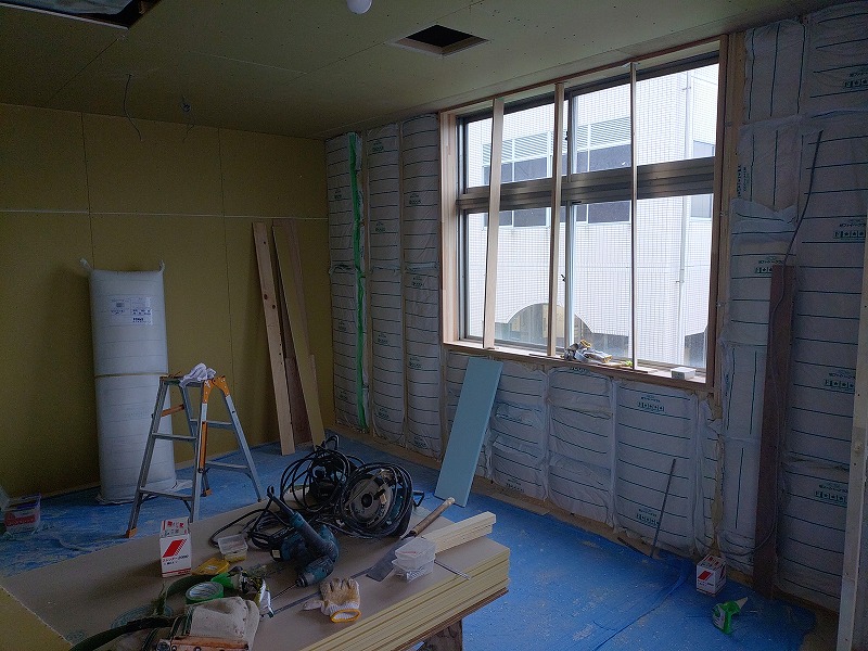 壁の外部面には断熱を施します。壁を組み立てた後、クロス仕上げにしていきます。