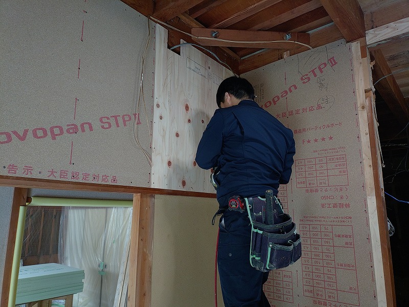 壁は土台から胴差までつなげるように張っていき、耐震壁として周囲に貼っていきました。