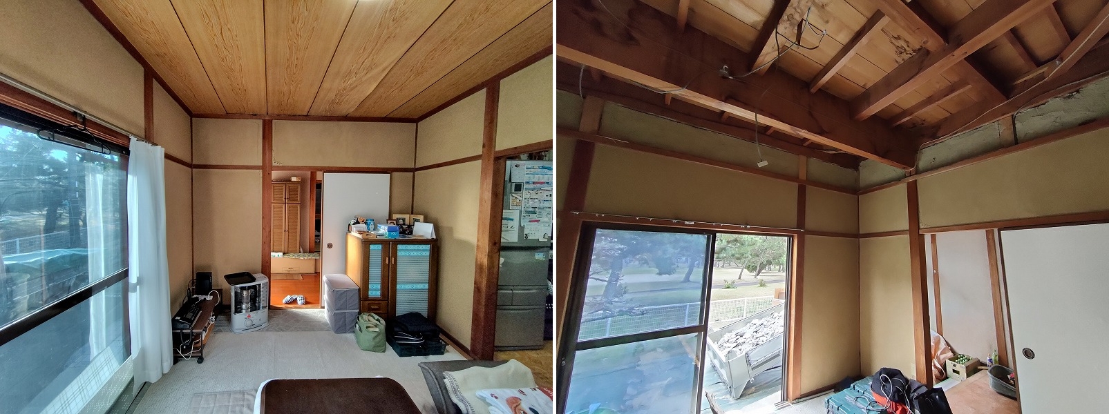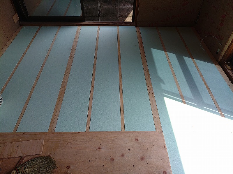 壁は傾いたりしていたので、胴縁で調整しながら壁を起こしていき、壁がまっすぐになるように不陸調整しながら組み立てていきます。