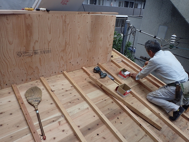 屋根の板(野地板)の上に木の桟(野垂木)を設置しています。