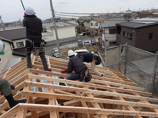 ケラバ(屋根の三角部分の外壁から出ている部分)の垂木(屋根を支える木)は予め作業場でハシゴ状に組んでおいて、レッカーで上げて設置します。